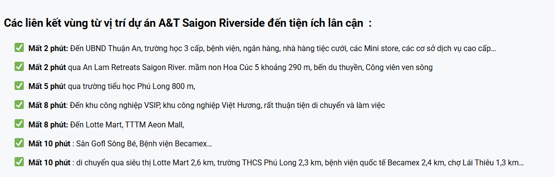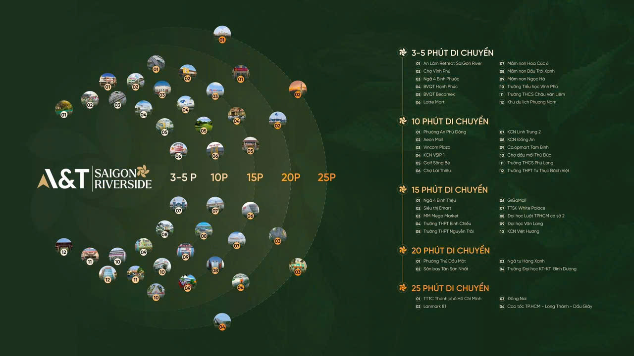 A&T Saigon Riverside nằm tọa lạc tại quỹ đất “vàng” hiếm hoi của Thành phố Thuận An, Bình Dương,được quy hoạch bài bản, kiến tạo một tổ ấm sang trọng, hiện đại và bình yên với mảng xanh “không lồ” cùng hệ tiện ích đẳng cấp.